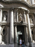 San Carlino alle Quattro Fontane kirkossa. Kirkko valmistui barokkiaikaan 1685. Hieno pikkuruinen kupoli. Osku laahusteli kirkon kaikki osat lävitse ja hävisi kryptaan. Pirkko etsiskeli aikansa, muttei löytänyt kuurupiiloon mennyttä. Aikansa venttailtuaan Pirkko siirtyi kadulle ja Osku tuli kryptan viileydestä myös päivänvaloon.